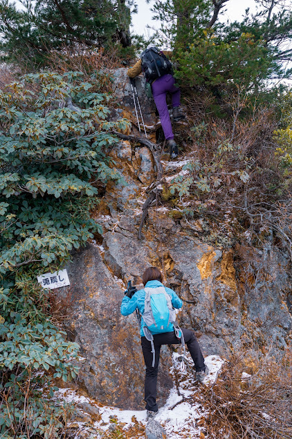 細尾根や鎖場を超えて10時30分烏帽岩に到着。この辺りから雪が積もっていました。