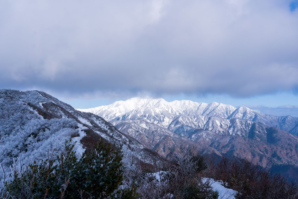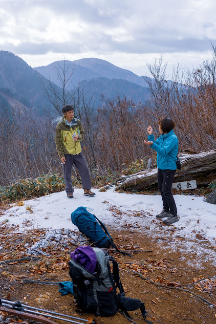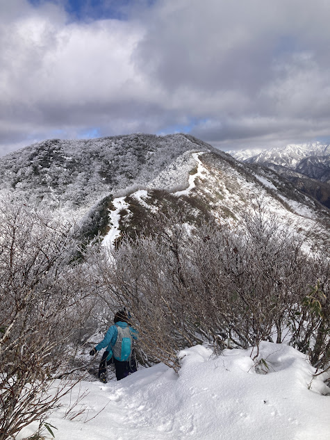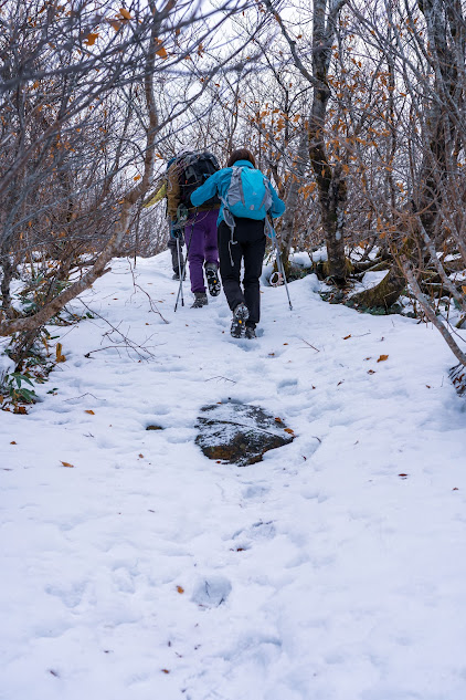 薄ら雪が現れてきました。ここから蒜場山が見えます。思った以上に遠くにあり嬉しいやら悲しいやら複雑な心境です。(おしゃべりが止まらない)