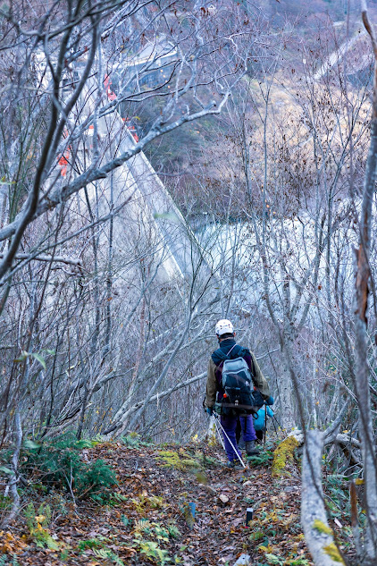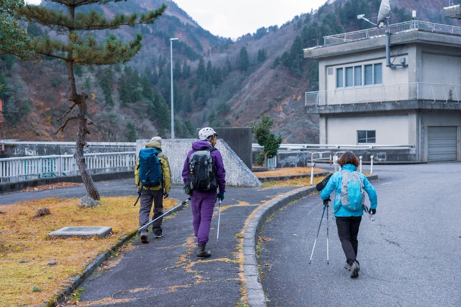 ダムの上を渡り切ると登山口があります。7時50分、おもったより寒いスタート。