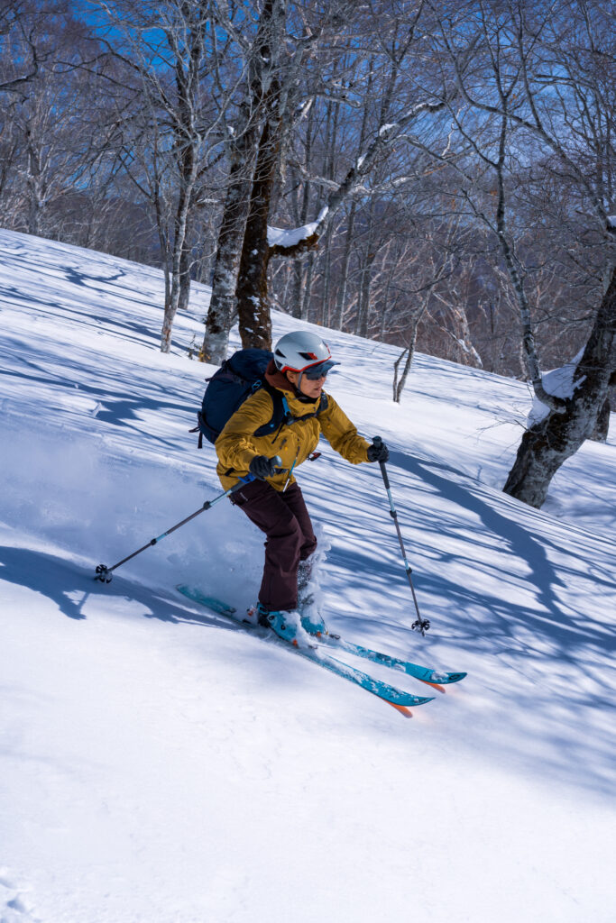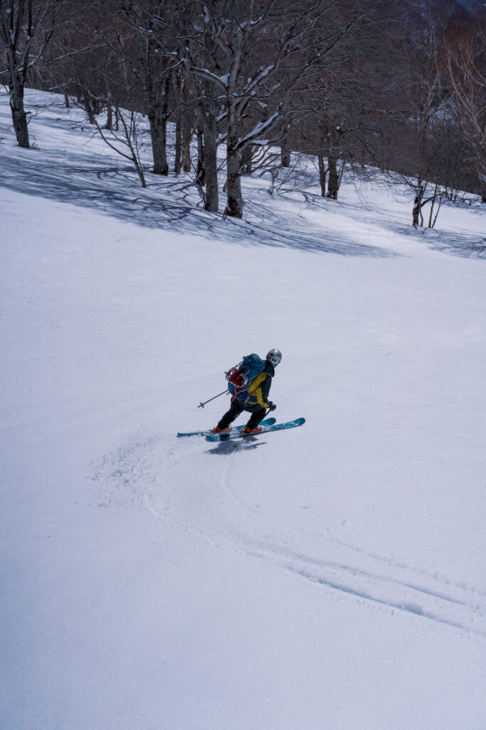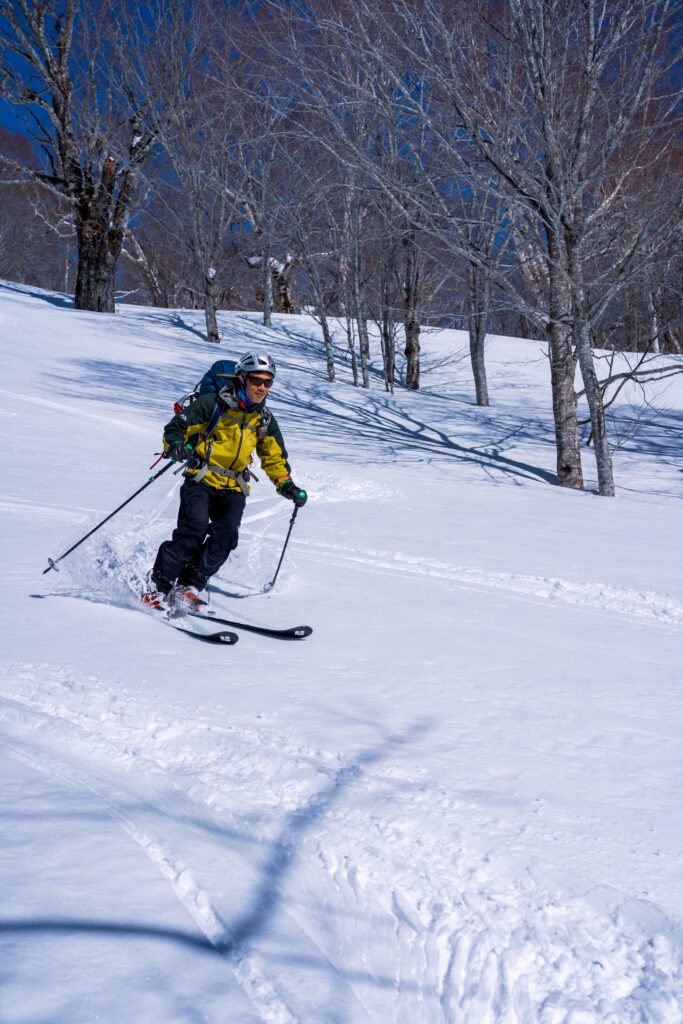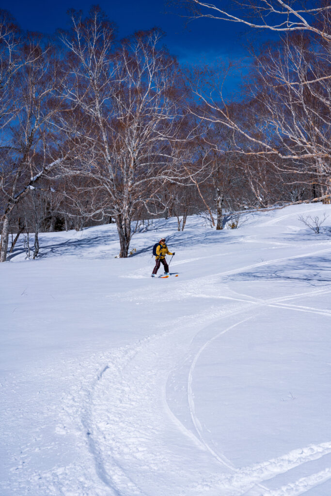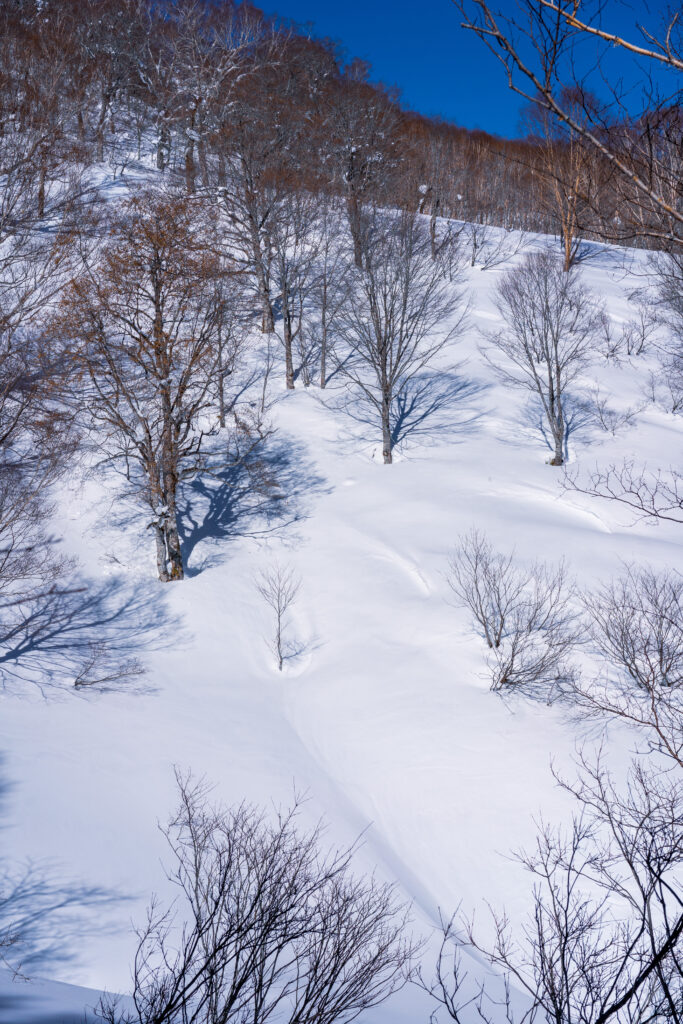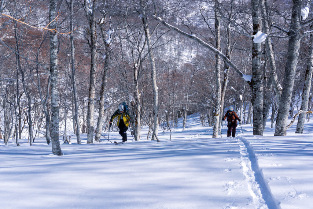 09:20、林道から外れて田代原へ直接進路をとる。斜度は適度で雪も締まっていて非常に歩きやすい。1500mを超えたところで徐々に大行山に向けて進路を西に向けていく。1620mくらいの地点でデブリだらけの沢地形や45度程度ある傾斜地のトラバースでヒヤリとする場面が続く。急斜面を乗っ越すと広々とした沢地形と、目指す大行山に向けたコルっぽい地形が見通せるようになる。樹林間も適度で歩きやすい。思えばこのあたりが一番雪質が良さそうで、ひと滑りするべきだったかもしれない。
