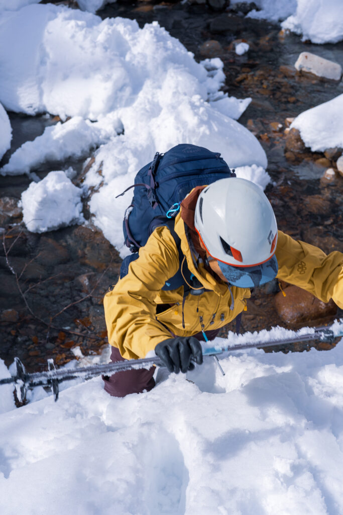 07:30、歩き出し。スキー場脇の林道を進む。しっかり圧雪がかかっているので歩きやすい。30分ほど歩いた地点で帰路の渡渉点を確認する。そこそこ積雪はあるが、さすがに沢が埋まり切るほどではない。渡渉には若干苦労しそうだ。さらに15分ほどで富士見下山荘跡を通過。ようやく本格的な登りにかかり、林道をショートカットしながら進む。