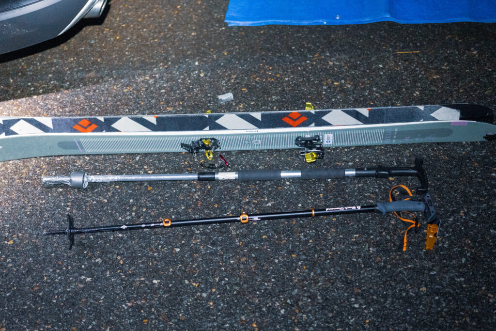 早朝、出発準備の段階で頼れるS藤さんがストックを忘れたことが発覚。自分はウィペット1本と通常のストック1セットの計3本持ってきていたので、1本はお貸しすることでなんとかなる。問題はもう1本だが、脳みそフル回転でどうにかならないか考えたところ、車に積んであったスノーブラシがおあつらえ向きの形状をしている。スクレーパー部分を外し、ガムテでバスケット状に加工して乗り切ることとした。
