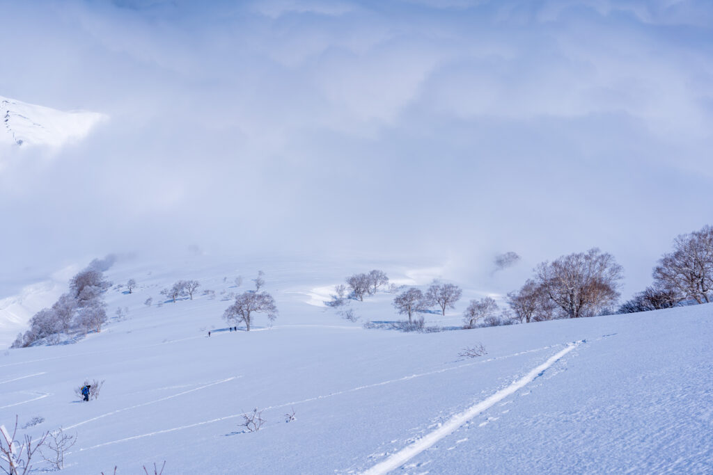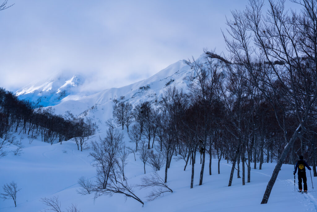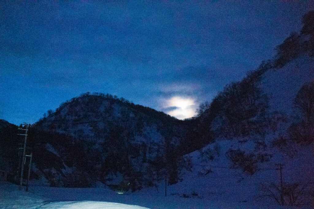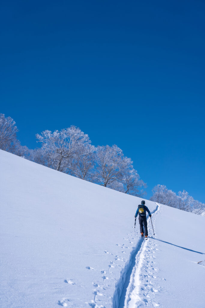 05:00頃出発。早朝は曇り+小雪混じりの雨模様で、やはり予報通り、今日はあまり期待できないかなと思っていたが、よく見ると上空が抜け星空が見え始めている。いつもの林道を詰め、標高を上げるにつれて雲を抜けていった。S藤さんの言葉は見事に的中し、07:20頃、アマナ平に到達する頃にはすっかり快晴に。風もほぼなく、これ以上ないコンディションだ。