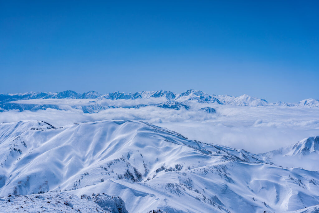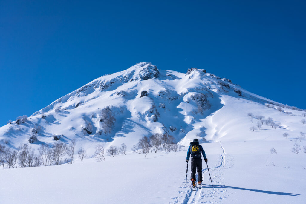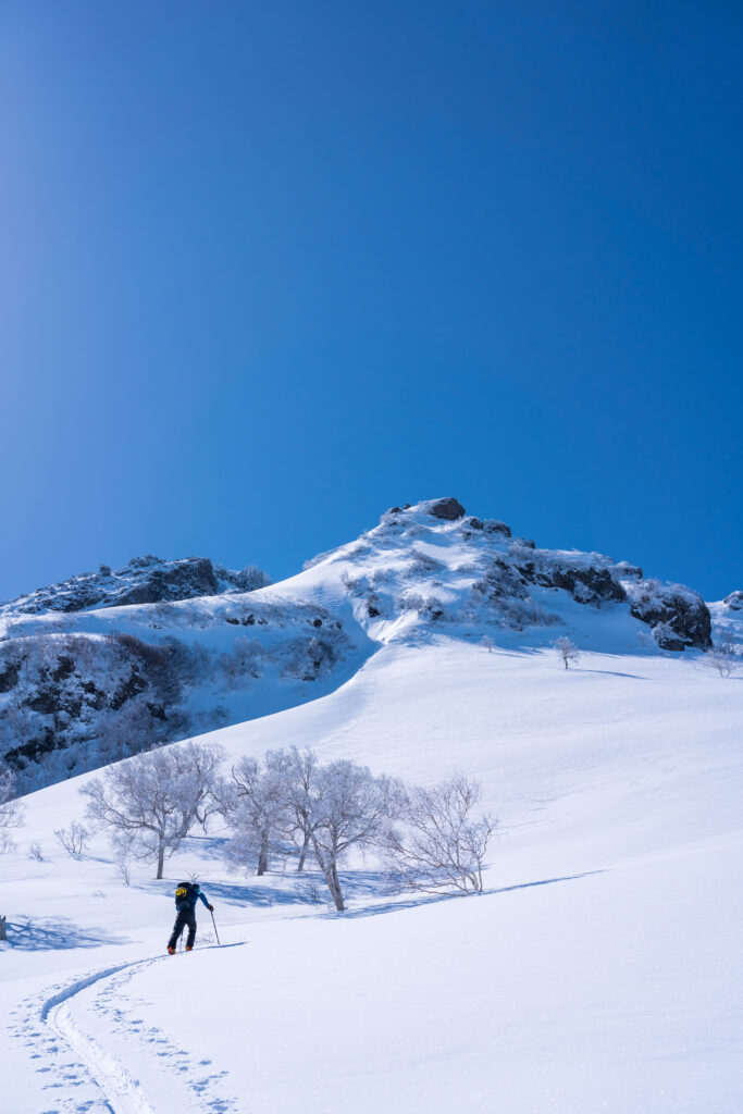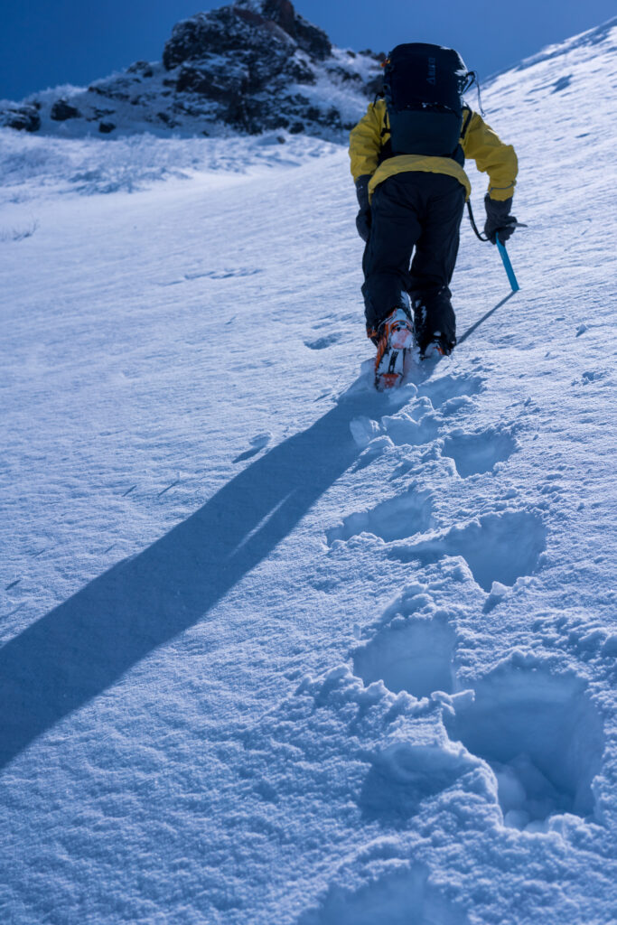 09:30頃、快晴のなか大曲を通過。1800mを超える焼山は未知のゾーンだ。ここまで続いていたトレースは藪の中に消えた。おそらく高松山方面に向かって滑走したのだろう。我々はこのまま山頂を目指すこととする。いよいよ斜度もきつくなり、2000mを超えたあたりの岩陰でスキー板をデポし、そこから先はアイゼンとピッケルを装備する。かなり斜度があり(40度以上?)、膝まで埋まる雪に苦労する。固めの氷化部分を狙って楽に歩きたいが、見極めが難しい。自身の体力不足と雪稜への不慣れさによるメンタル低下でペースが落ちる。何より2000mを超えてからの残り400mが長いこと長いこと・・・。かなりメンタルを削られた。それでも快晴に助けられながら歩みを進める。