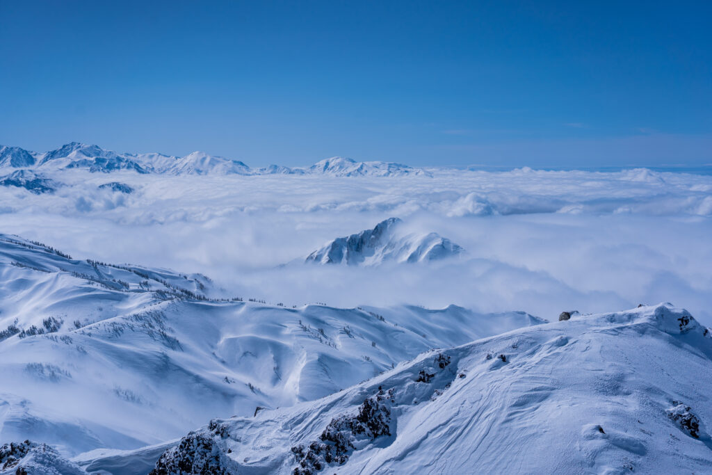 12:40頃、結局想定より1時間近くオーバーして、念願の新潟焼山の山頂を踏んだ。山頂は完全に雲を抜け、360度遮るもののない最高の景色が広がっていた。眼下の雲海の中に山々がよく見え、苦労した分の感慨はひとしおだった。ここで大休止。