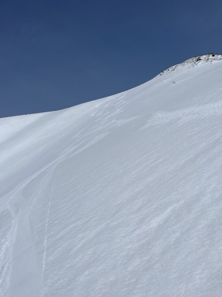 07:30頃、大原スキー場跡地を出発。ゆっくり現場到着からのスタートとなったが、天気は快晴。先行車両は5台ほど。今日あたりはメジャールートである二分方面は激混みになっていそうなので、こちらは快適に山行できそうだ。できるだけ板を脱がずに上がりたかったのだけれど、藤平山の稜線に至る直下は雪が割れていたため、標高差で50mほどだけシートラをした。シートラの前後で4人ほど追い抜く。登りに使った稜線から向かって右手側の斜面は、どこも雪が全層で落ちておりギタギタな状態。このまま雪が繋がっていることを祈りつつ先へと進んだ。
