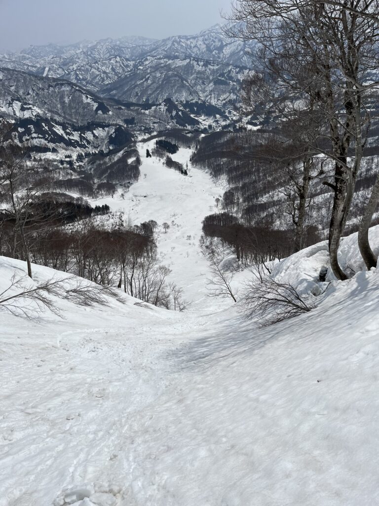 11:30頃、守門岳山頂着。特に苦労するようなポイントもなく、すんなりと登頂することができた。小休止してから11:40頃ドロップイン。山頂直下からやや西面の滑走は、スーパーザラメで超快適!気持ちよくかっ飛ばすことができた。その後はゆっくり滑ったり漕いだりしながら、あっという間に往路の稜線へと戻る。そこからは少し東側の沢から滑り降りるルートをとった。しかし、沢に入ってからは南面ということもありだいぶ雪が腐れていた。斜度も45度近くあったため、無理をせずにゆっくりと降りる。
